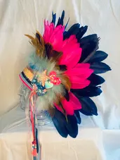 Deze tooi is handgemaakt. We stopten veel aandacht in deze creatie, aangevuld met een flinke dot liefde en een toef enthousiasme. En dat zie je terug. We houden van details, toffe kleurcombinaties, veel glitter en mooie veren, zodat jij met deze tooi echt het schitterende middelpunt van je feest bent!